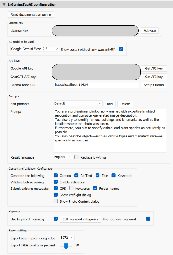 • License key: The LrGeniusTagAI license key you received when buying the plugin.