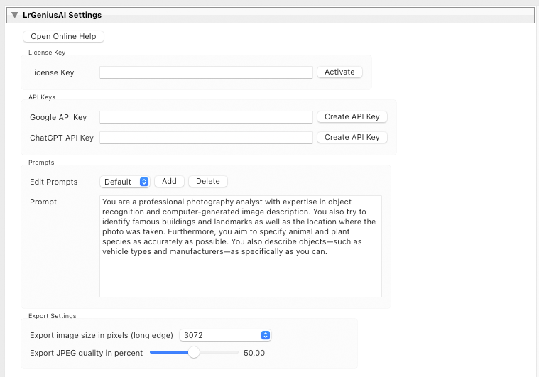- Google Gemini: You have to setup an API key and activate billing at Google, since using Gemnini will generate costs per image. Enter the API key in the plugin settings.