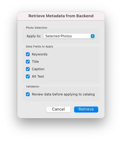 - Save generated data to catalog Disabling this option enables you to prevent the generated metadata from being saved directly to the Lightroom catalog. Useful when you want to review the data before saving. This can be done via Library -> Plug-In Extras -> Retrieve metadata from backend.