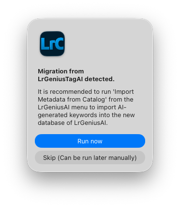 When you update from LrGeniusTagAI to LrGeniusAI, the plugin will automatically migrate your existing metadata to the new version on first run. This includes keywords, titles, captions, and alt-text that were previously generated by LrGeniusTagAI. You will be presented a prompt to start the migration process after the update.