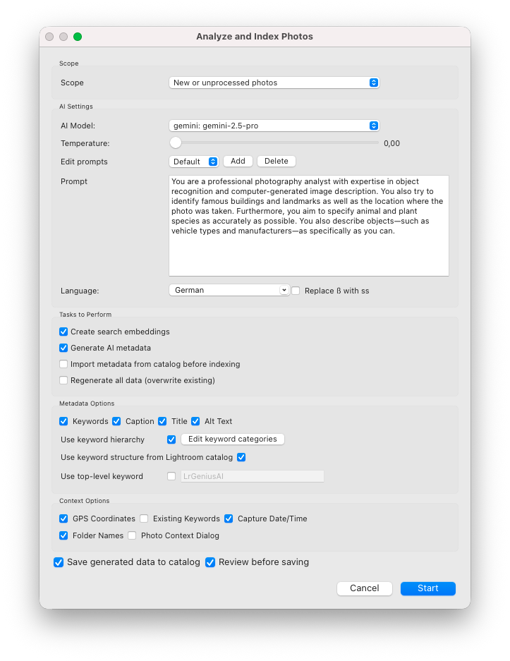 - Regenerate all data (overwrite existing) If not selected, only data not present in the LrGeniusAI database is generated.